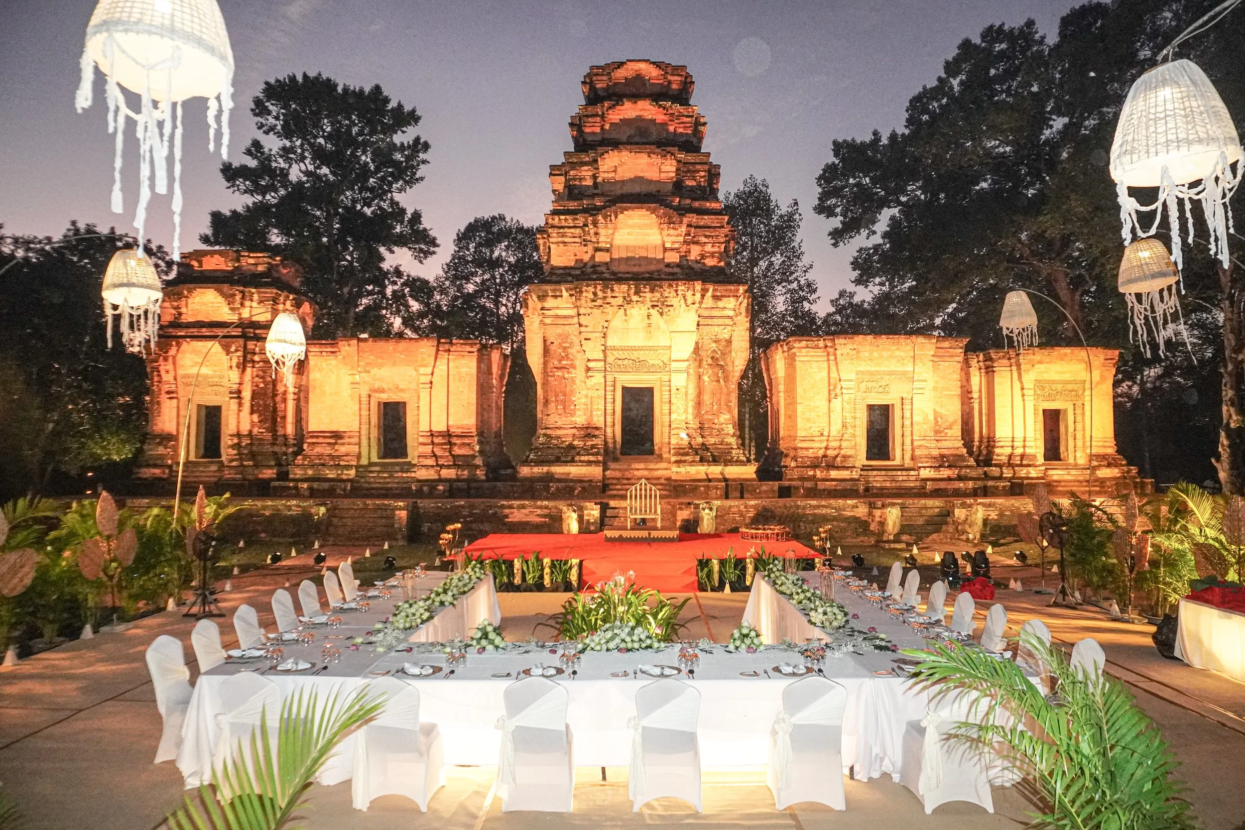 Our Gala Dinner experience at Prasat Kravan accommodates groups of up to 150 guests, hosted from 6:00 pm to 10:30 pm — an evening of heritage, elegance, and refined indulgence beneath the stars of Angkor.